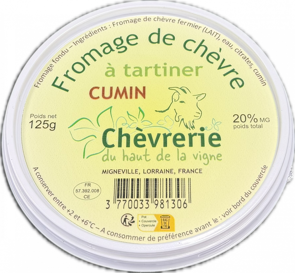 Ingredients: Lait entier pasteurisé de nos chèvre (lactose), sel, présure, eau, citrates, Cumin.