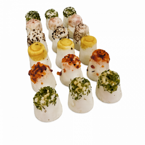 Petit fromages frais aromatisé pour apéritif, présenté dans une petite boîte de dégustation, 100 % lait de chèvre 18 unités.