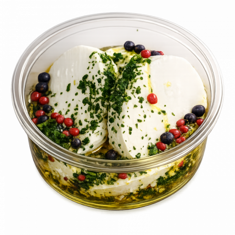 Fromage de chèvre frais dans de l'huile de colza avec baies roses, baies de genièvre, et ail et fines herbes fraîche (200g)